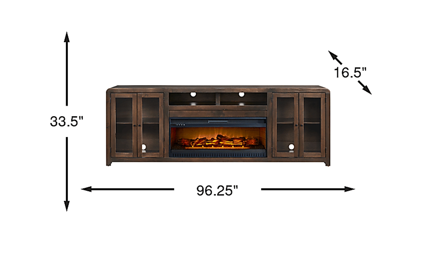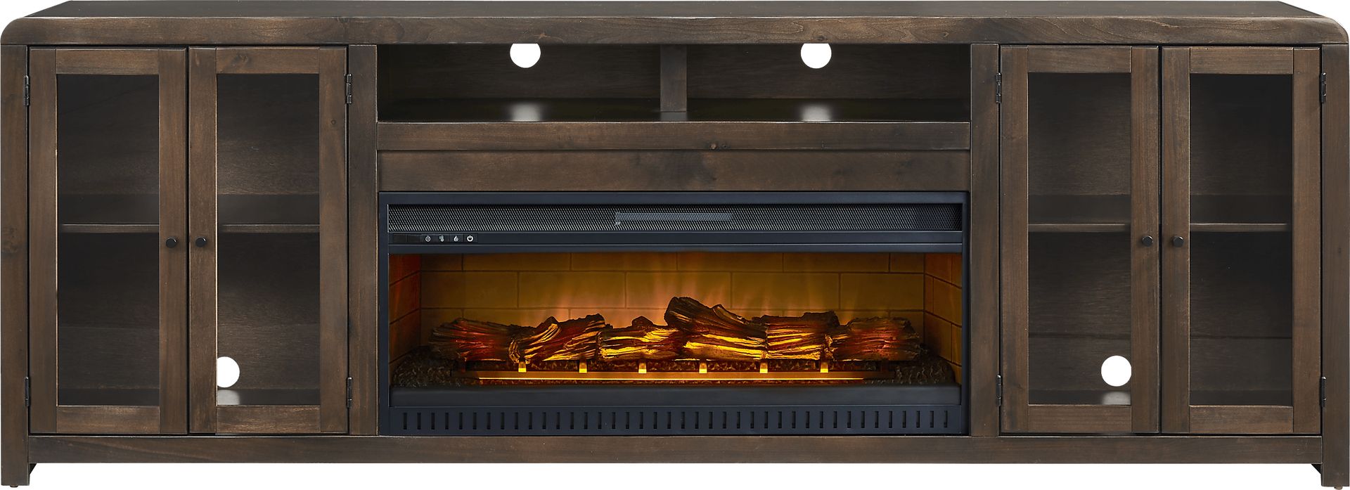 Symmetrical and timeless with a charming perspective of cozy warmth and poise, the Montavilla console is designed to enhance both style and comfort in your home. Crafted from poplar wood, this contemporary piece boasts a rich espresso finish that effortlessly complements any style. Showcasing two doors that provide easy access to storage and a top center cubby that offers the perfect space for media devices or display items, this console is built to accommodate televisions up to 75 inches. Adjustable shelves ensure customizable organization, while wire management holes keep cords neatly concealed. The removable fireplace portion features flickering flames and faux embers, working with or without heat for a warm ambiance year-round.