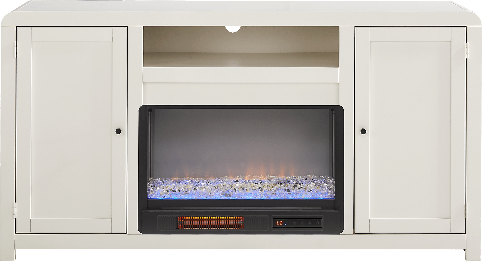 Symmetrical and timeless with a charming perspective of cozy warmth and poise, the Montavilla console is designed to enhance both style and comfort in your home. This contemporary piece boasts a white finish that effortlessly complements any style. Showcasing two doors that provide easy access to storage and a top center cubby that offers the perfect space for media devices or display items, this console is built to accommodate televisions up to 65 inches. Adjustable shelves ensure customizable organization, while wire management holes keep cords neatly concealed. The removable fireplace portion features a realistic energy-saving LED firebox with remote controlled heat and ambient lighting with four color changing options. LED color effects can be used with or without heat.