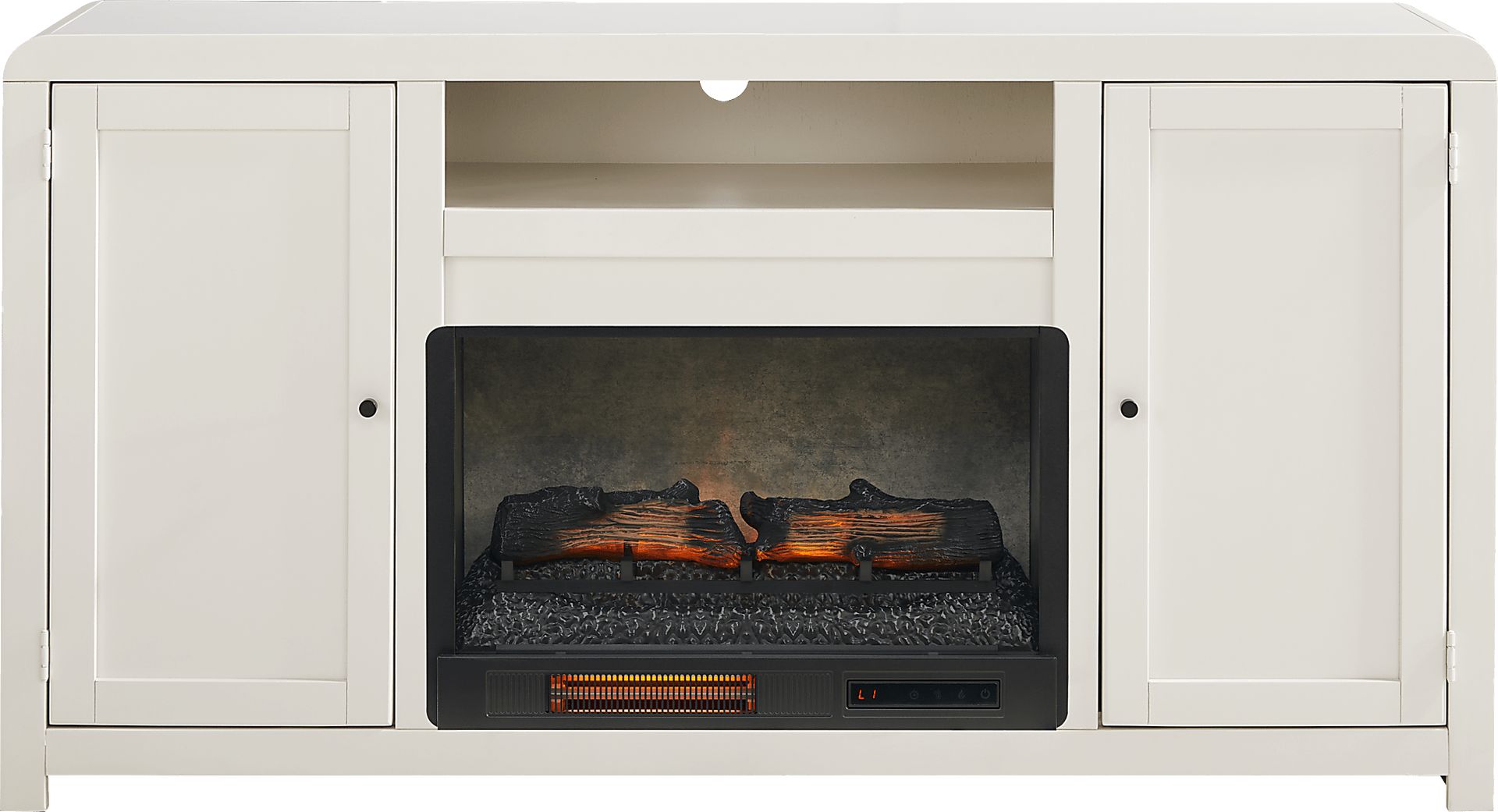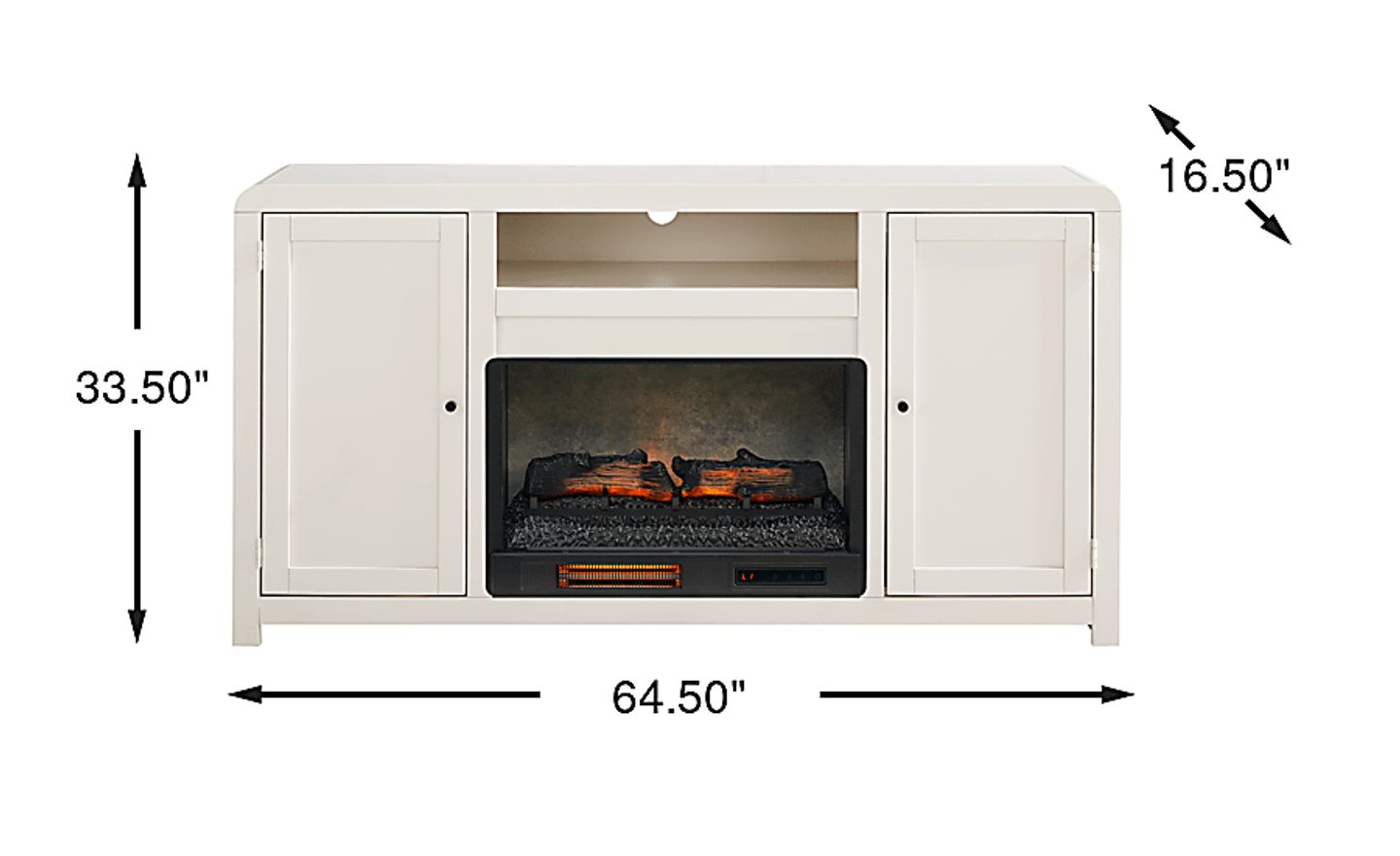 Symmetrical and timeless with a charming perspective of cozy warmth and poise, the Montavilla console is designed to enhance both style and comfort in your home. This contemporary piece boasts a white finish that effortlessly complements any style. Showcasing two doors that provide easy access to storage and a top center cubby that offers the perfect space for media devices or display items, this console is built to accommodate televisions up to 65 inches. Adjustable shelves ensure customizable organization, while wire management holes keep cords neatly concealed. The removable fireplace portion features flickering flames and faux embers, working with or without heat for a warm ambiance year-round.
