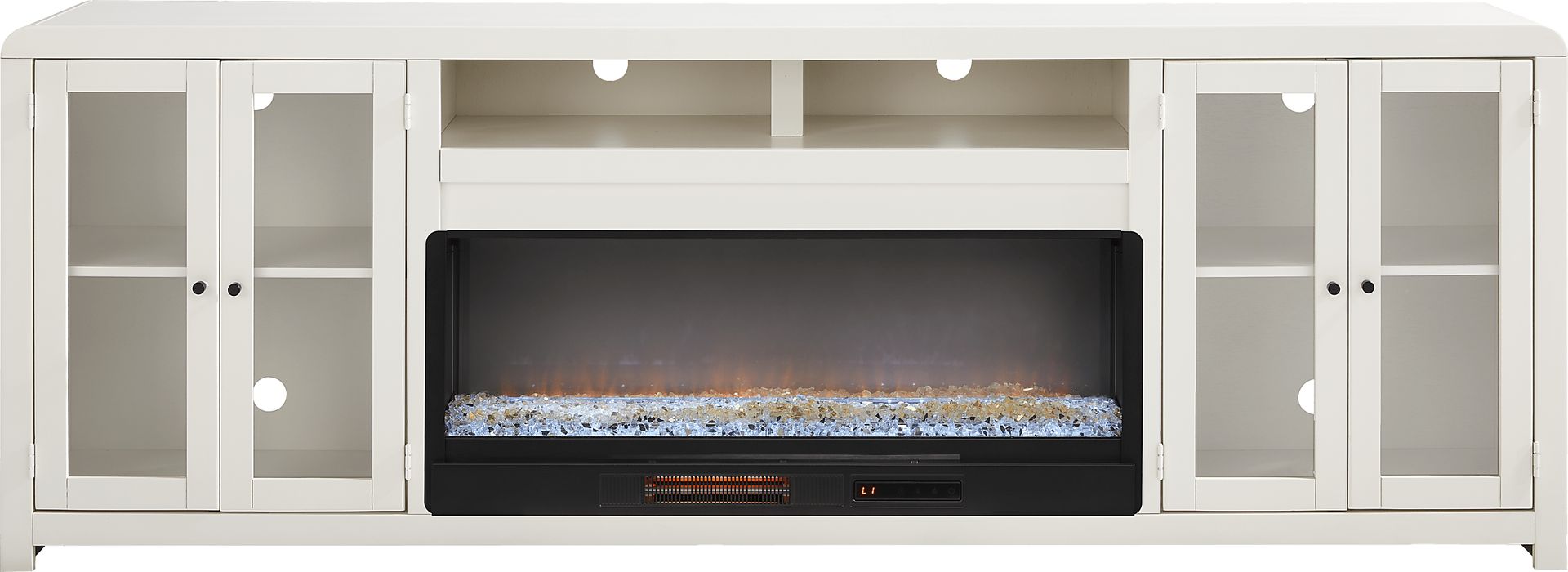 Symmetrical and timeless with a charming perspective of cozy warmth and poise, the Montavilla console is designed to enhance both style and comfort in your home. Showcasing two doors that provide easy access to storage and a top center cubby that offers the perfect space for media devices or display items, this console is built to accommodate televisions up to 75 inches. Adjustable shelves ensure customizable organization, while wire management holes keep cords neatly concealed. The removable fireplace portion features a realistic energy-saving LED firebox with remote controlled heat and ambient lighting with four color changing options. LED color effects can be used with or without heat.