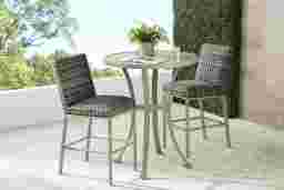 The Montecello outdoor bar height dining set from Cindy Crawford Home beautifully combines casual beachside living and contemporary style. A 36-inch round rust-resistant aluminum tabletop in a gray finish is accentuated with a slatted design and elegant curved legs. Two matching stools feature padded seats and all-weather wicker for exceptional comfort and long lasting color.