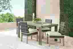 The Montecello outdoor dining set from Cindy Crawford Home beautifully combines casual beachside living and contemporary style. A 40 x 74-inch solid eucalyptus tabletop in a gray finish is accentuated with a slatted design and waterfall-style legs. Four side chairs in woven wicker feature twine-colored cushions in a durable outdoor fabric for lasting enjoyment, mold and mildew resistance, and UV-resistant color.