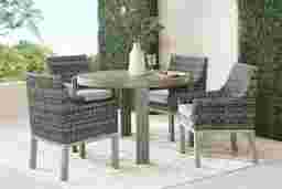 The Montecello outdoor dining set from Cindy Crawford Home beautifully combines casual beachside living and contemporary style. A 50-inch round solid eucalyptus tabletop in a gray finish is accentuated with a slatted design and waterfall-style legs. Four arm chairs in woven wicker feature misty green cushions in a durable outdoor fabric for lasting enjoyment, mold and mildew resistance, and UV-resistant color.