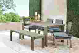 The Montecello outdoor dining set from Cindy Crawford Home beautifully combines casual beachside living and contemporary style. A 40 x 74-inch solid eucalyptus tabletop in a gray finish is accentuated with a slatted design and waterfall-style legs. Four side chairs in woven wicker feature azure cushions in a durable outdoor fabric for lasting enjoyment, mold and mildew resistance, and UV-resistant color. The set is completed with a eucalyptus bench for family-style dining.