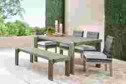 The Montecello outdoor dining set from Cindy Crawford Home beautifully combines casual beachside living and contemporary style. A 40 x 74-inch solid eucalyptus tabletop in a gray finish is accentuated with a slatted design and waterfall-style legs. Four side chairs in woven wicker feature mist cushions in a durable outdoor fabric for lasting enjoyment, mold and mildew resistance, and UV-resistant color. The set is completed with a eucalyptus bench for family-style dining.