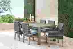 The Montecello outdoor dining set from Cindy Crawford Home beautifully combines casual beachside living and contemporary style. A 40 x 74-inch solid eucalyptus tabletop in a gray finish is accentuated with a slatted design and waterfall-style legs. Four side chairs and two arm chairs in woven wicker feature azure cushions in a durable outdoor fabric for lasting enjoyment, mold and mildew resistance, and UV-resistant color.