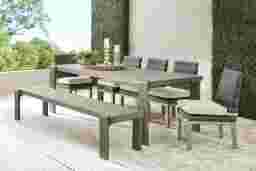 The Montecello outdoor dining set from Cindy Crawford Home beautifully combines casual beachside living and contemporary style. A 40 x 98-inch solid eucalyptus tabletop in a gray finish is accentuated with a slatted design and waterfall-style legs. Five side chairs in woven wicker feature twine cushions in a durable outdoor fabric for lasting enjoyment, mold and mildew resistance, and UV-resistant color. The set is completed with a eucalyptus bench for family-style dining.