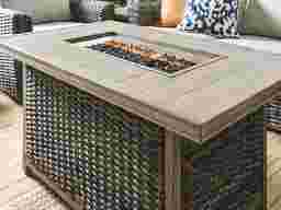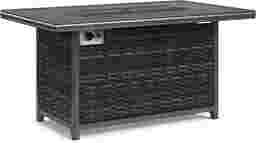 Bring chic and sophisticated style to your patio with the coziness of the Montecello fire pit from the Cindy Crawford Home collection. Featuring a gray wicker exterior and a wood panel inspired top, this piece is perfect for adding a dose of ambience to any outdoor area. The fire height and heat are adjustable, ideal for accommodating groups of any size. It uses a push button igniter and a standard propane tank (not included) with 50,000 BTU. The fire pit comes complete with a lid and fire glass.