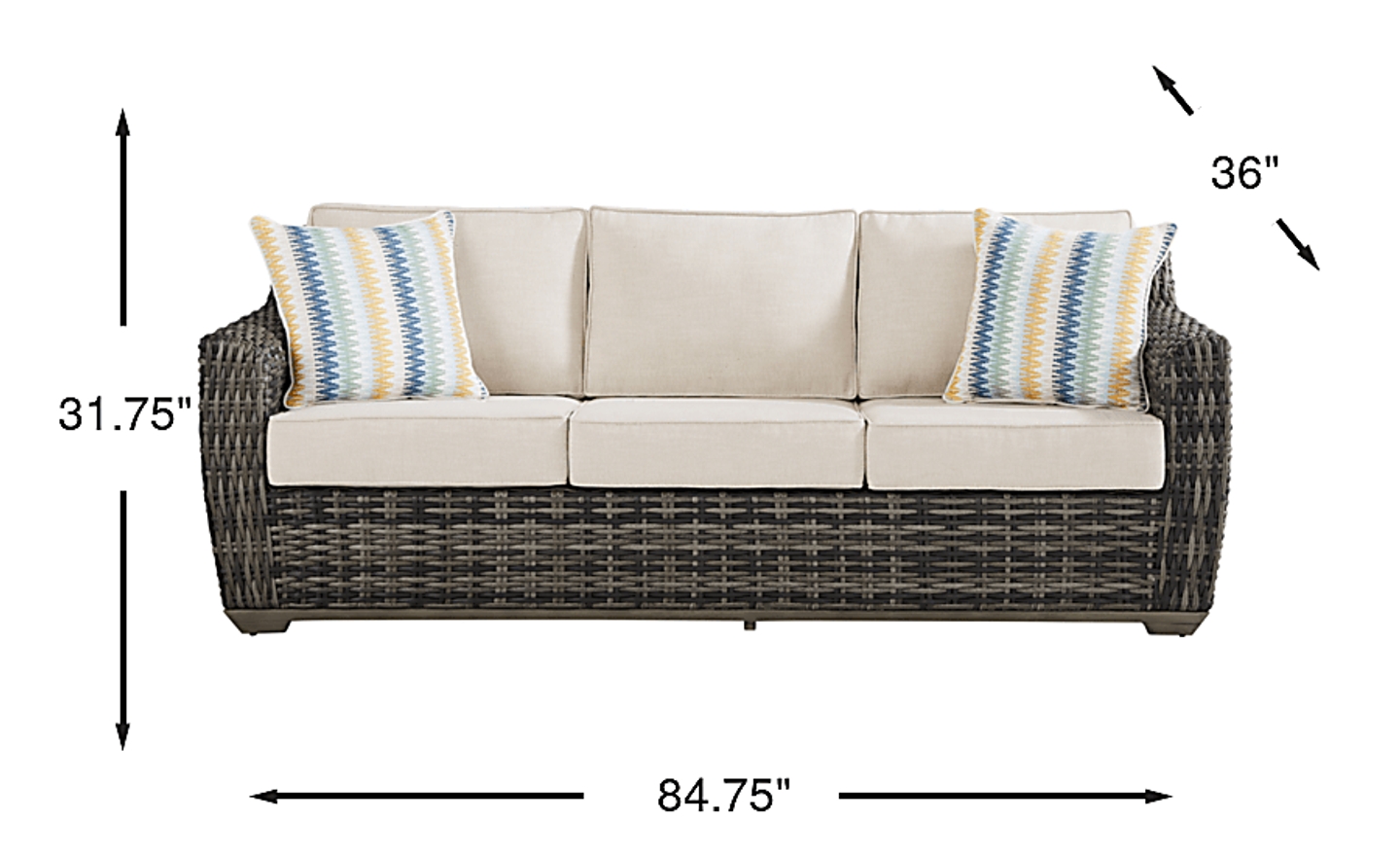 The Montecello sofa from Cindy Crawford Home beautifully combines casual beachside living and contemporary style. All-weather woven wicker over a fully-welded rustproof aluminum frame boasts driftwood-inspired shades of gray, tan and brown. Durable performance fabric covered cushions in a twine color are colorfast, mold and mildew resistant for durable outdoor use. Decorative toss pillows add a beautiful designer touch.