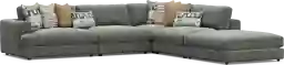 A cozy invitation to unwind and enjoy a warm, comfortable embrace with a dose of casual cool are just the beginning when it comes to the Drew & Jonathan Montecito modular sectional. A versatile centerpiece with family-friendly style, this laid-back contemporary set offers seat cushions with a plush custom blend of feathers, fiber and down surrounding a supportive foam core for comfort that’s soft yet structured, all upholstered in striking charcoal gray chenille. Oversized wedge arms and extra-wide seats complete the look with plenty of room to spare. Plus, this sectional has the flexibility to be reconfigured, again and again, to fit your changing needs and taste. Upholstery: 100% Polyester. Cleaning Instructions: Use water based cleaning agents or foam.