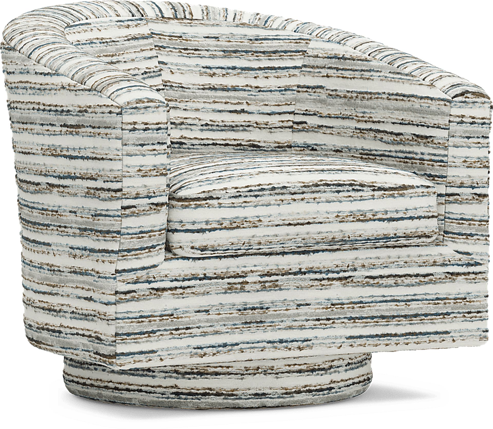 A cozy invitation to unwind and enjoy a warm, comfortable embrace with a dose of casual cool are just the beginning when it comes to the Drew & Jonathan Montecito swivel chair. A versatile accent piece with family-friendly style, this laid-back contemporary seat features luxurious charcoal gray jacquard fabric with a layered bar pattern in multiple neutral shades. The round base features a swivel function for 360-degree convenience. Curved track arms and an extra-deep seat complete the look. Upholstery: 97% Polyester 3% Acrylic.