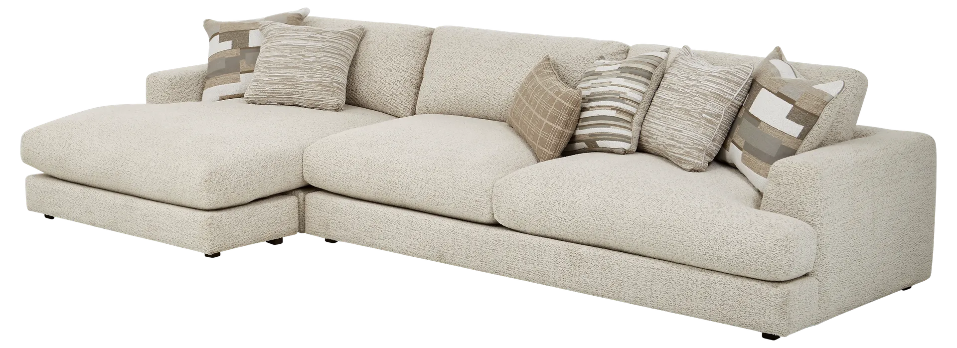 This sectional features a sophisticated seating construction designed for a "warm, comfortable embrace." Unlike standard sofas that use only foam, these cushions utilize a plush custom blend of feathers, fiber, and down wrapped around a supportive foam core. This combination provides the immediate, sink-in softness of down with the structural integrity of foam, ensuring the extra-wide seats remain comfortable and hold their shape over time.