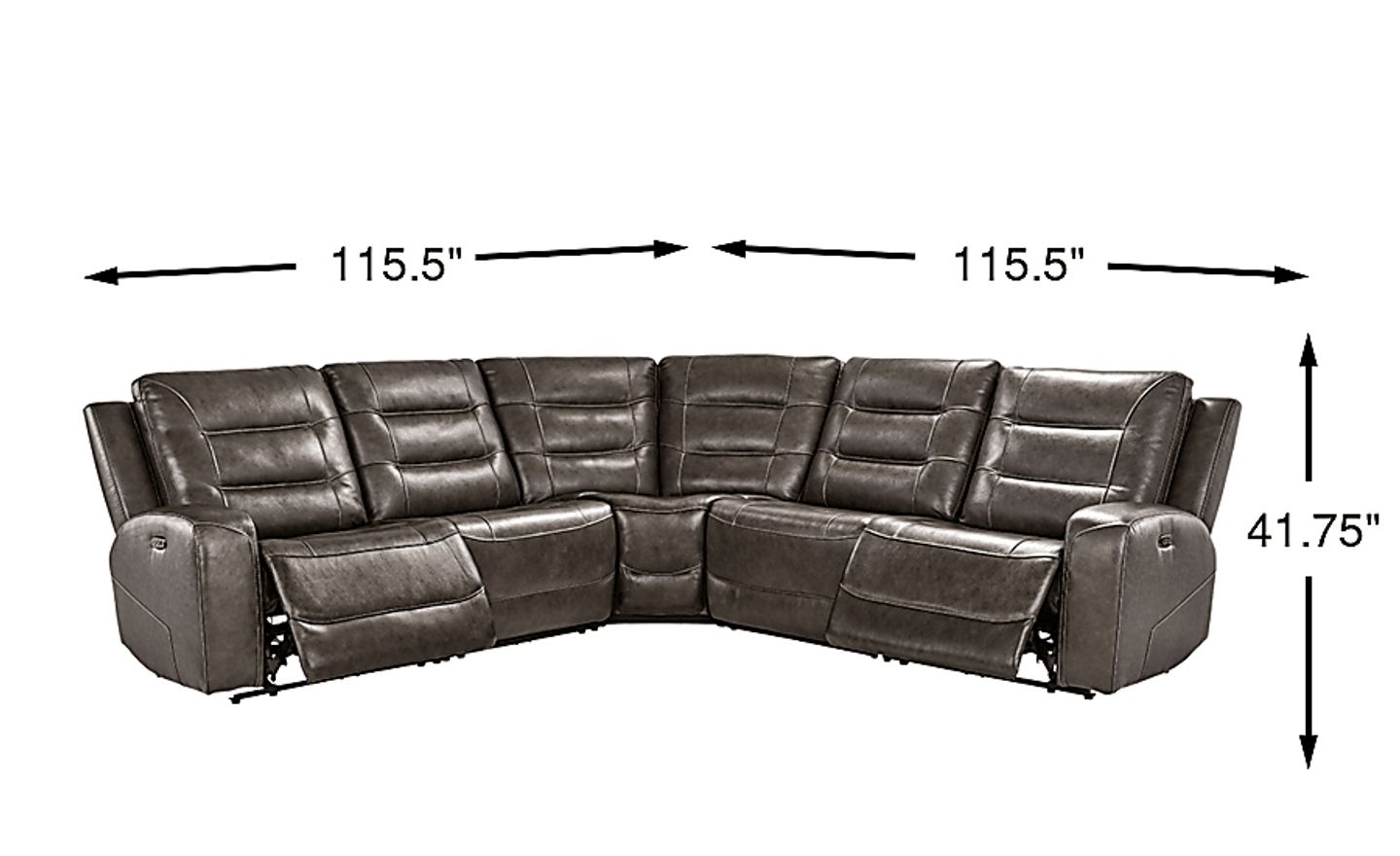 Ever at the ready, gracefully composed and undeniably refined, Montero blends timeless charm with everyday ease in one unforgettable living room collection. Cloaked in alluring charcoal top grain leather where the body touches, this sectional leads the charge in relaxation with dual power reclining features designed for premium comfort. Left-arm and right-arm facing recliners offer personalized positioning with power-adjustable headrests and footrests, while a dual power armless recliner, armless chair and plush padded corner wedge deliver seamless additional support throughout the set. Built-in USB ports keep modern utility close at hand so you can charge, relax and recharge in style. Upholstery: Top grain leather where the body touches and polyurethane fabric sides and backs. Leather is a durable, low maintenance product, however, general regular maintenance is necessary. To keep your leather clean, vacuum it regularly, removing any dust, and clean it with water and a mild non-detergent soap. Accent pillows not included.