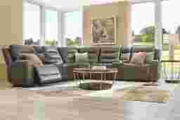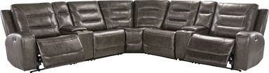 Ever at the ready, gracefully composed and undeniably refined, Montero blends timeless charm with everyday ease in one unforgettable living room collection. Cloaked in alluring charcoal top grain leather where the body touches, this sectional leads the charge in relaxation with dual power reclining features designed for premium comfort. Left-arm and right-arm facing recliners offer personalized positioning with power-adjustable headrests and footrests, while a dual power armless recliner, armless chair and plush padded corner wedge deliver seamless support throughout the set. A pair of built-in consoles offer additional convenience with storage cup holders and USB ports, keeping modern utility effortlessly within reach so you can charge, unwind and recharge in style. Upholstery: Top grain leather where the body touches and polyurethane fabric sides and backs. Leather is a durable, low maintenance product, however, general regular maintenance is necessary. To keep your leather clean, vacuum it regularly, removing any dust, and clean it with water and a mild non-detergent soap. Accent pillows not included.