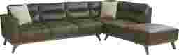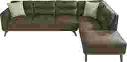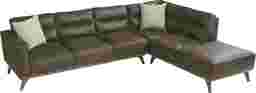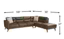 With its contemporary appeal and spacious setup, the Montinello sectional is perfect for those who want to create a special living room space. Upholstered in soft woven fabric with channeling detail, it comes in an inviting brown color. Featuring sleek, sophisticated track arms and tapered legs, this sectional boasts a full wooden base that adds to the stylish, mid-century appeal. Two patterned pillows complete the look. 100% Polyester. To achieve the same look, purchase two additional orange pillows as pictured above.