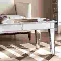 The split-mirror design provides a natural visual anchor for your decor. We suggest utilizing the "rule of thirds": use one section of the table for a curated stack of books and the other for a decorative tray to group smaller items like candles or remotes. Because the mirrored surface acts as a secondary spotlight for your accents, a minimalist arrangement works best to let the contemporary Hollywood Glam aesthetic shine.