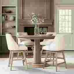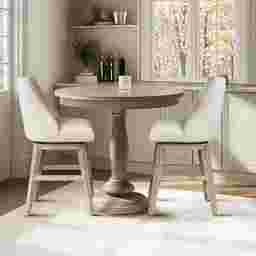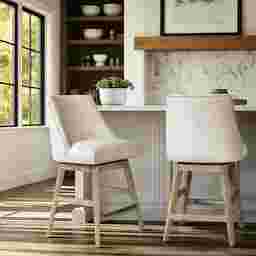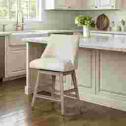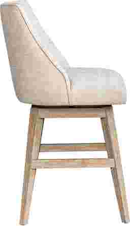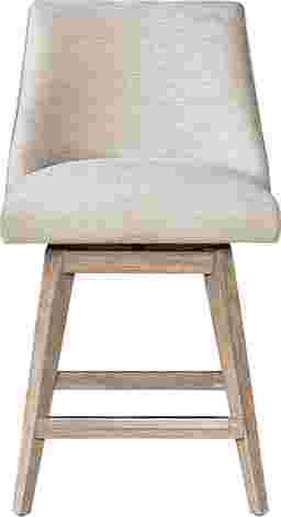 The Moonshadow light gray swivel counter height stool blends farmhouse charm with everyday function. A tailored silhouette, piped upholstery, and armless design offer refined style and space-saving versatility. The curved back, padded seat, and 360-degree swivel deliver comfort and ease. Solid wood legs in a distressed finish include adjustable levelers for stability. Perfect for kitchen islands, breakfast bars, or workspaces. Customer assembly is required.