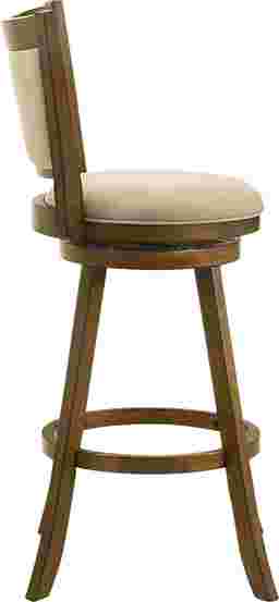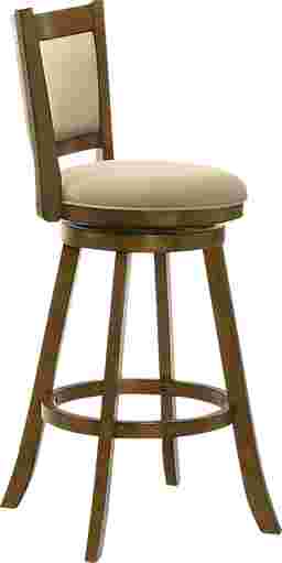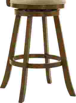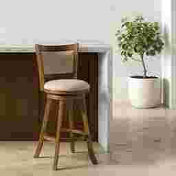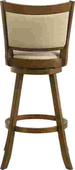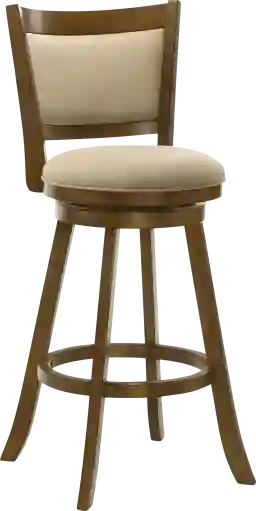 Elevate your dining or bar space with the inviting charm of the Moonworth barstool, a perfect blend of transitional farmhouse warmth and modern comfort. Designed with soft curves, natural materials, and a rich brown wood finish, the Moonworth stool brings timeless elegance and practicality to any home setting, whether styled around a cozy kitchen island or a polished entertainment area. Crafted from durable solid natural wood and finished in a smooth brown tone, each stool highlights the natural wood grain and exudes organic appeal. The curved panel backrest provides ergonomic support, while the plush round seat delivers comfort through resilient, soft-to-touch fabric upholstery that holds up beautifully to daily use. A smooth 360-degree swivel mechanism ensures effortless rotation, making it ideal for casual dining, entertaining guests, or enjoying morning coffee. A built-in circular footrest and sturdy flared legs enhance balance and comfort, while the polyester-blend performance fa
