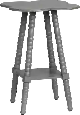 Even in a dark gray wood finish, the Moraga gray end table has a clover-shaped tabletop that will bring you luck and perhaps even a smile. It fits into any small space, with traditionally spindled legs and a lower shelf for display of things you love. You choose how to make this piece really work for you and your space. Customer assembly is required.