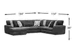 Cocktail hour style meets sleepover comfort with the Moreau Street sectional's easy charm. Transitional in style, this enticing sectional features a design that's equal parts stunning and fun, with black scatterback cushions in an irresistibly textured ultra-soft fabric. Mingle with guests or get together with the whole family in complete comfort across five seats and a chaise, with low-profile padded wedge arms providing added coziness and flare. Plush, rounded seat cushions deliver indulgent relaxation and are also removeable and easy to clean. Coordinating pillows are included. Upholstery: 100% Polyester.