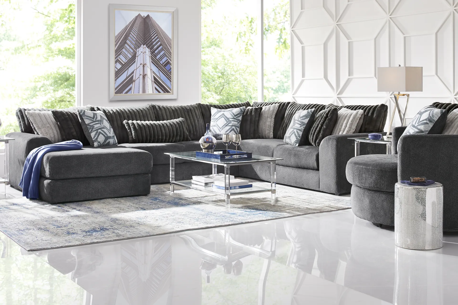 Cocktail hour style meets sleepover comfort with the Moreau Street sectional's easy charm. Transitional in style, this enticing sectional features a design that's equal parts stunning and fun, with black scatterback cushions in an irresistibly textured ultra-soft fabric. Mingle with guests or get together with the whole family in complete comfort across five seats and a chaise, with low-profile padded wedge arms providing added coziness and flare. Plush, rounded seat cushions deliver indulgent relaxation and are also removeable and easy to clean. Coordinating pillows are included. Upholstery: 100% Polyester.
