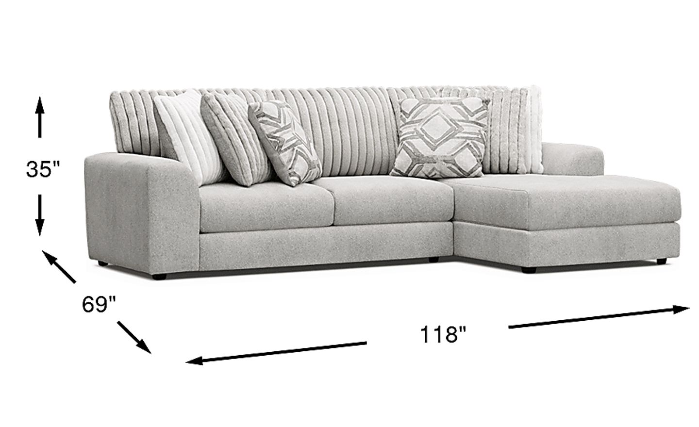 Measuring for a sectional of this scale requires checking both your floor space and your home's entry points. With a total width of 118 inches and a chaise depth of 69 inches, we recommend following the "2/3 rule," where the sofa occupies roughly two-thirds of the available wall space. To maintain easy movement, ensure you have at least 18 to 24 inches of clearance for walkways. Because this model arrives as a 2-piece set, it is often easier to maneuver through standard hallways and doorways than a single-piece sofa of the same size.