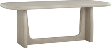 Cultivating an atmosphere of serene ease and intimate connection, the Morena dining table introduces a tranquil balance of organic warmth and sculptural simplicity. Crafted with oak veneers in a soft stone-gray finish, this transitional piece features a rectangular top with rounded corners and a bold pedestal base with sweeping curves.