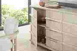 Designed with organization in mind, this piece features three center drawers that are perfect for stowing away table linens, napkins, and silverware. In addition to the drawers, two cabinet doors open to reveal spacious internal shelving, providing a dedicated home for larger serving platters, heirloom bowls, or seasonal dinnerware that you want to keep protected but accessible.