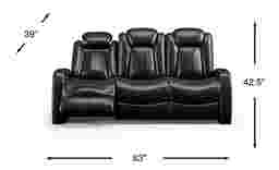 Cozy comfort gets a tech-savvy update with the Moretti dual power reclining sofa. Upholstered in supple brown top grain leather where the body touches with a contrasting stitching detail, this sofa is designed to create the ultimate relaxation station. Touch activated dual power reclining chaise style footrests and headrests place the perfect position at your fingertips, while bucket seats offer additional comfort. Each armrest features a lighted cupholder, USB port and built-in storage compartment, while the center seat back cushion folds down to reveal a table top with two cup holders, two wireless charging pads and magazine storage. Upholstery: Top grain leather where the body touches and vinyl sides and backs.
