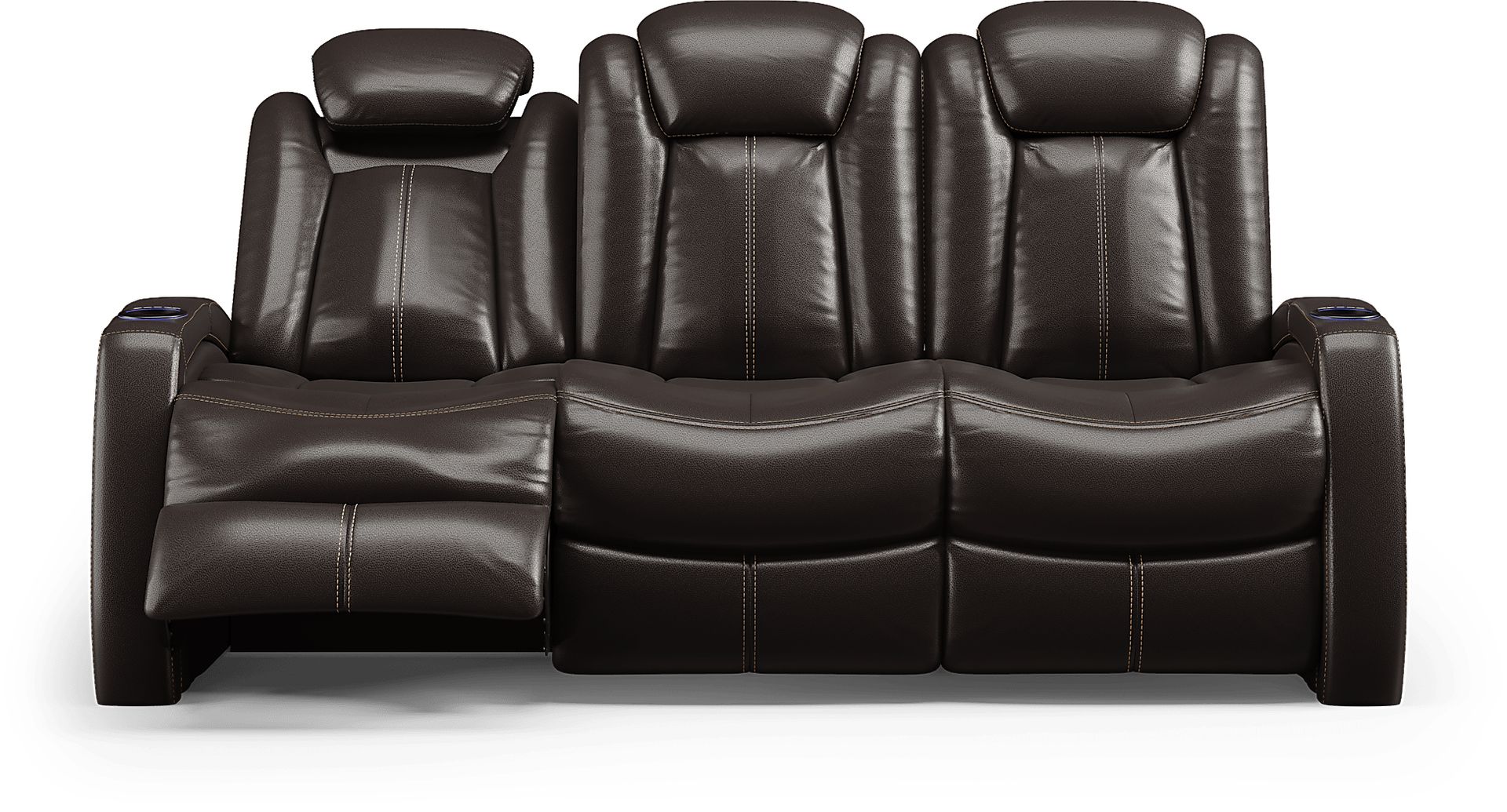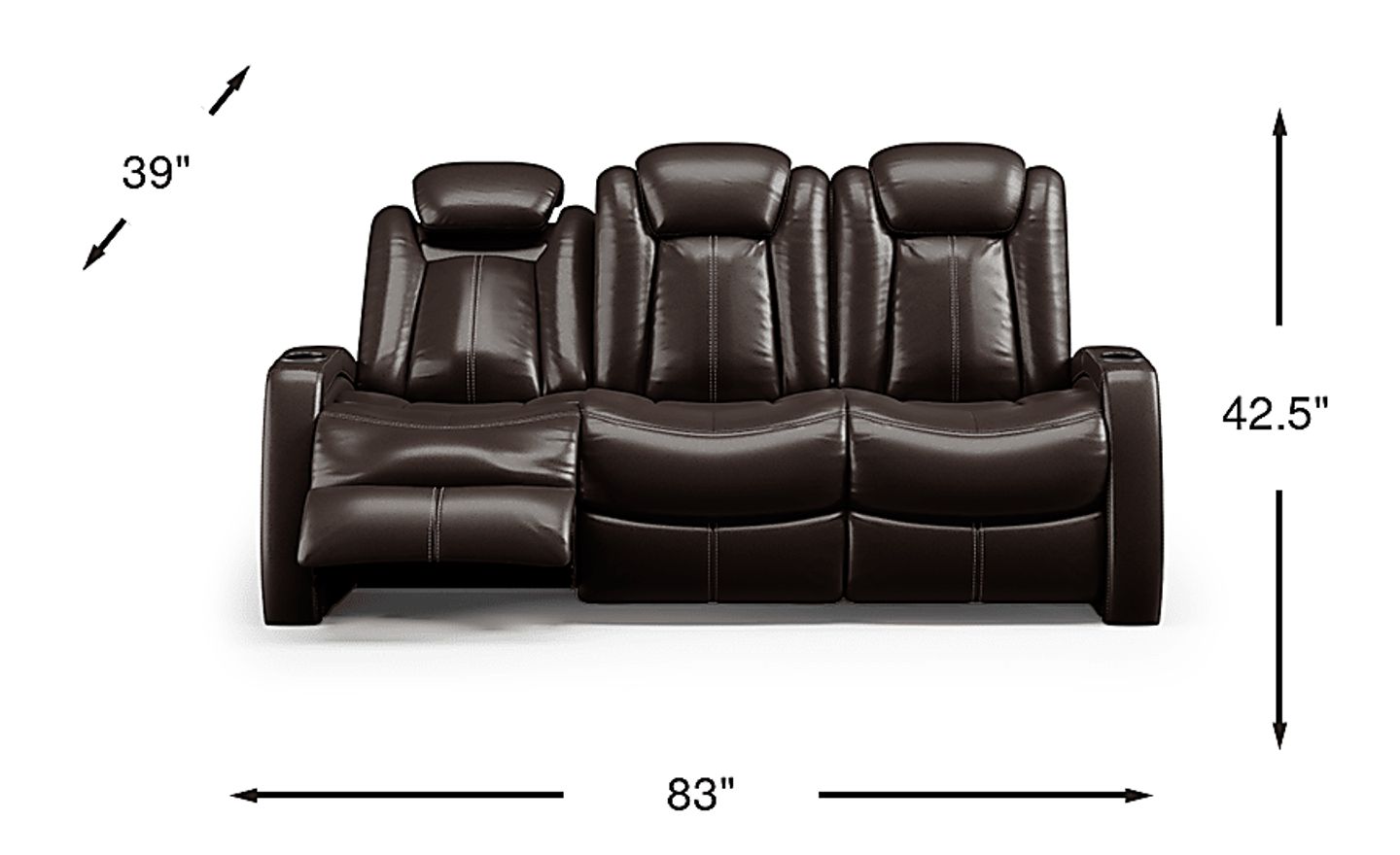 Cozy comfort gets a tech-savvy update with the Moretti dual power reclining sofa. Upholstered in supple brown top grain leather where the body touches with a contrasting stitching detail, this sofa is designed to create the ultimate relaxation station. Touch activated dual power reclining chaise style footrests and headrests place the perfect position at your fingertips, while bucket seats offer additional comfort. Each armrest features a lighted cupholder, USB port and built-in storage compartment, while the center seat back cushion folds down to reveal a table top with two cup holders, two wireless charging pads and magazine storage. Upholstery: Top grain leather where the body touches and vinyl sides and backs.