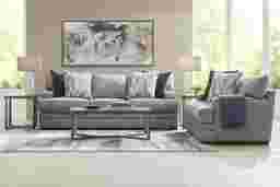 The Morgan Falls sofa features plush, loose seat cushions and a comfortable pillow back, designed for optimal relaxation. While specific cushion filling densities can vary, Rooms To Go sofas are generally constructed with quality materials aimed at providing good support and maintaining shape with proper care, such as regular fluffing and rotating of cushions to ensure even wear.