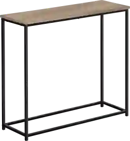 Bring an extra dimension to your entryway with this simple Mornay accent console. The spacious dark taupe wood-look laminated surface will bring your decorative pieces to life or use it as a convenient spot to put down your keys, phone, or mail. Finished on all sides, this contemporary hallway table with an open black metal frame, can easily be used in a variety of spaces such as behind a sofa, a small hallway, foyer or anywhere that needs that compact accent furniture to give a small space a little bit of flare. Customer assembly is required.