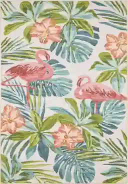 Absolutely. This rug features a versatile design that transitions seamlessly between indoor and outdoor environments. It is ideal for coastal-inspired patios, decks, or porches. When used outside, it provides a durable, weather-resistant layer that can withstand the elements while maintaining its vibrant botanical pattern and multi-colored aesthetic.