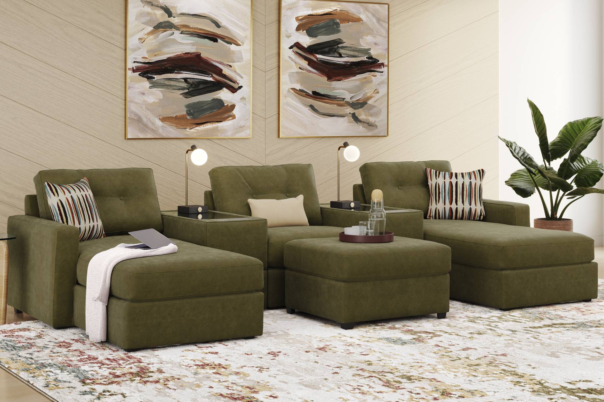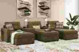 Discover the limitless possibilities of the Drew & Jonathan ModularOne, thoughtfully designed with comfort and flexibility in mind. This customizable seating solution features individual pieces that can be reconfigured to the shape you need. Game days, movie nights, sleepovers, and everyday relaxation are all better when the seating arrangement you want is always right at your fingertips. Each individual piece is upholstered on all sides in our signature fabric, New Horizon. This soft, moss-colored chenille includes Repreve yarn, made with recycled plastic bottles. The upholstery in this collection boasts welted track arms, top-stitched seat cushions and button-tufted back cushions for an elegant silhouette. Two media consoles provide hidden storage, USB charging ports, wireless charging, Bluetooth speakers, and double as side tables with sleek acrylic tops. Includes LAF chaise, two consoles, armless chair, ottoman, and RAF chaise. Visit a showroom to learn more about individual components and to work with a sales specialist to customize your own configuration today. Upholstery: 100% Polyester.