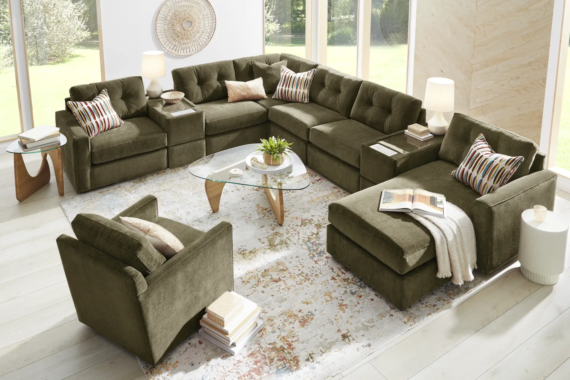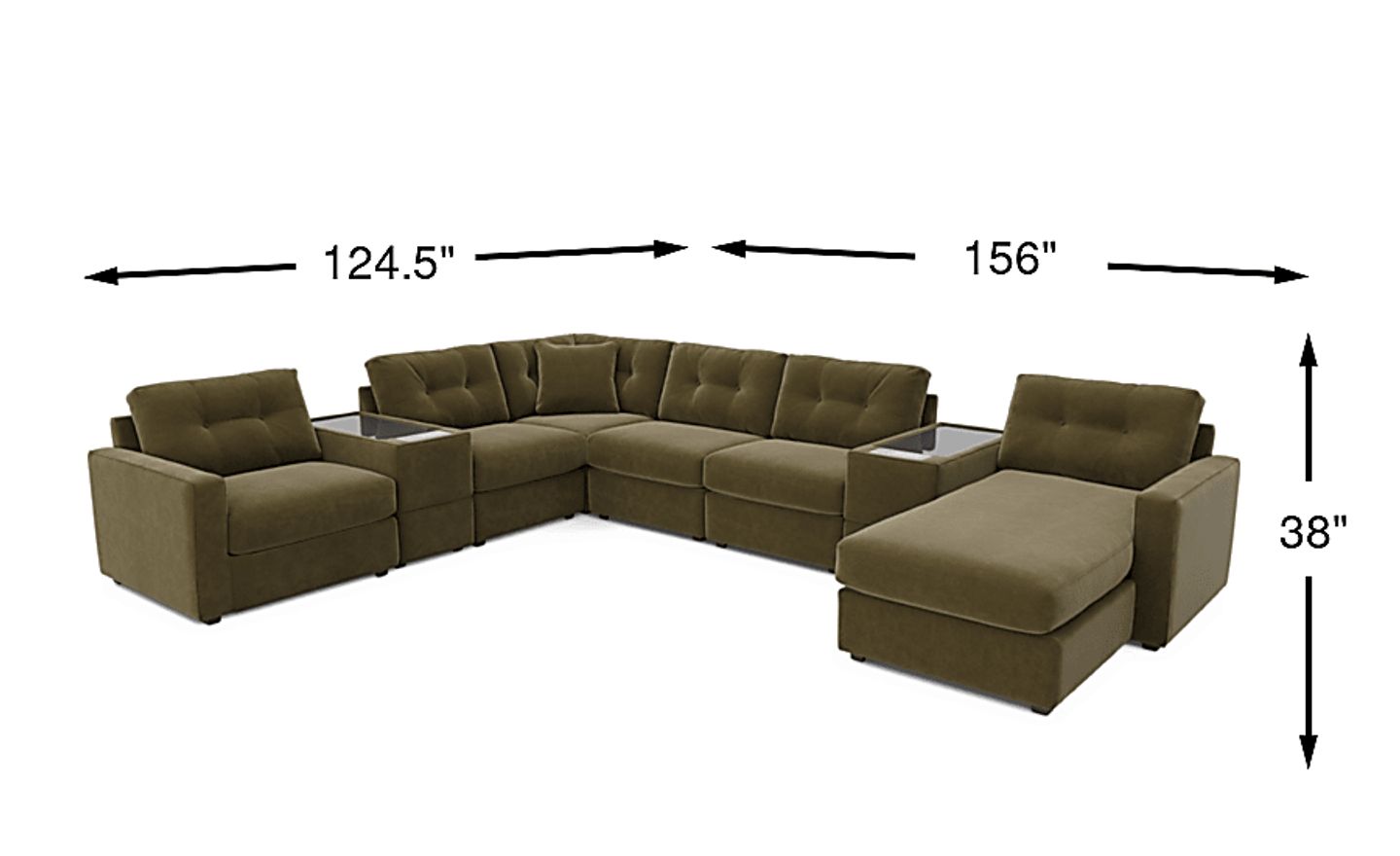 Discover the limitless possibilities of the Drew & Jonathan ModularOne, thoughtfully designed with comfort and flexibility in mind. This customizable seating solution features individual pieces that can be reconfigured to the shape you need. Game days, movie nights, sleepovers, and everyday relaxation are all better when the seating arrangement you want is always right at your fingertips. Each individual piece is upholstered on all sides in our signature fabric, New Horizon. This soft, moss-colored chenille includes Repreve yarn, made with recycled plastic bottles. The open seating offers welted track arms, top-stitched seat cushions and button-tufted back cushions for an elegant silhouette. Two media consoles provide hidden storage, USB charging ports, wireless charging, Bluetooth speakers, and double as side tables with sleek acrylic tops. Includes RAF chaise, two consoles, three armless chairs, corner wedge, and LAF chair. Visit a showroom to learn more about individual components and to work with a sales specialist to customize your own configuration today. Upholstery: 100% Polyester.