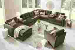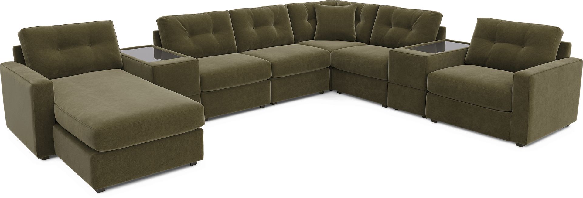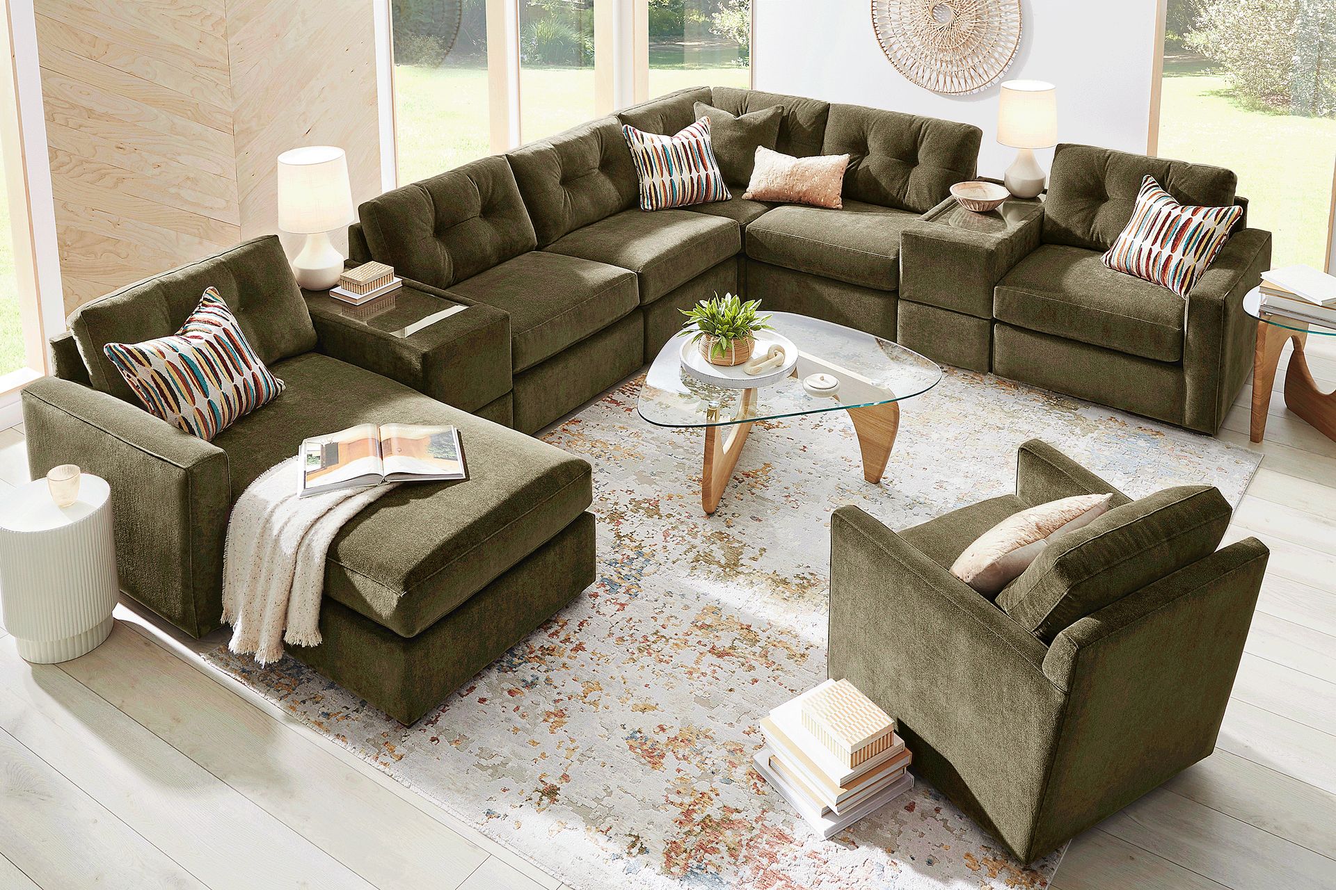 Discover the limitless possibilities of the Drew & Jonathan ModularOne, thoughtfully designed with comfort and flexibility in mind. This customizable seating solution features individual pieces that can be reconfigured to the shape you need. Game days, movie nights, sleepovers, and everyday relaxation are all better when the seating arrangement you want is always right at your fingertips. Each individual piece is upholstered on all sides in our signature fabric, New Horizon. This soft, moss-colored chenille includes Repreve yarn, made with recycled plastic bottles. The open seating includes a chaise and has welted track arms, top-stitched seat cushions and button-tufted back cushions for an elegant silhouette. Two center consoles provide hidden storage and double as side tables with an acrylic top. A matching pillow provides the perfect final touch. Includes LAF chaise, two consoles, three armless chairs, corner wedge, and RAF chair. Visit a showroom to learn more about individual components and to work with a sales specialist to customize your own configuration today. Upholstery: 100% Polyester.