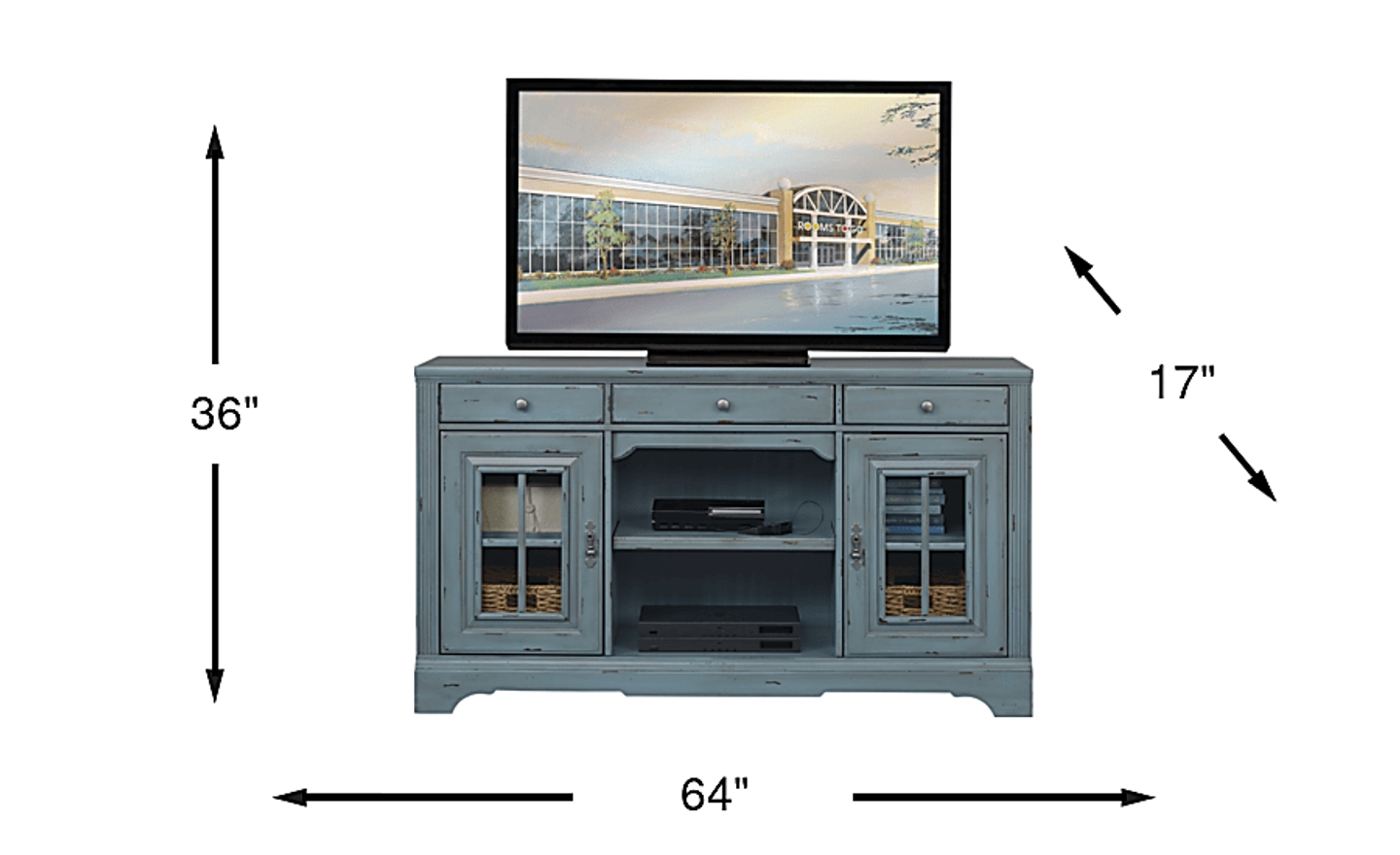 The Mountain Bluff is a traditionally styled console crafted in poplar solids and selected maple veneers. This impressive piece is enhanced by large scale moldings and subtle details rendered in a hydra blue finish and accented with barrel pewter finish hardware. The finish is hand applied, distressed, glazed and highlighted to capture the authentic worn look of yesteryear. Able to hold up to a 60 inch LCD or LED TV, the console features an open center area with two shelves for electronics, adjustable shelves behind two framed glass doors and cut outs for wire management. Three drawers along the upper portion of the console provide the perfect place to put TV accessories, manuals, and other items for easy access.