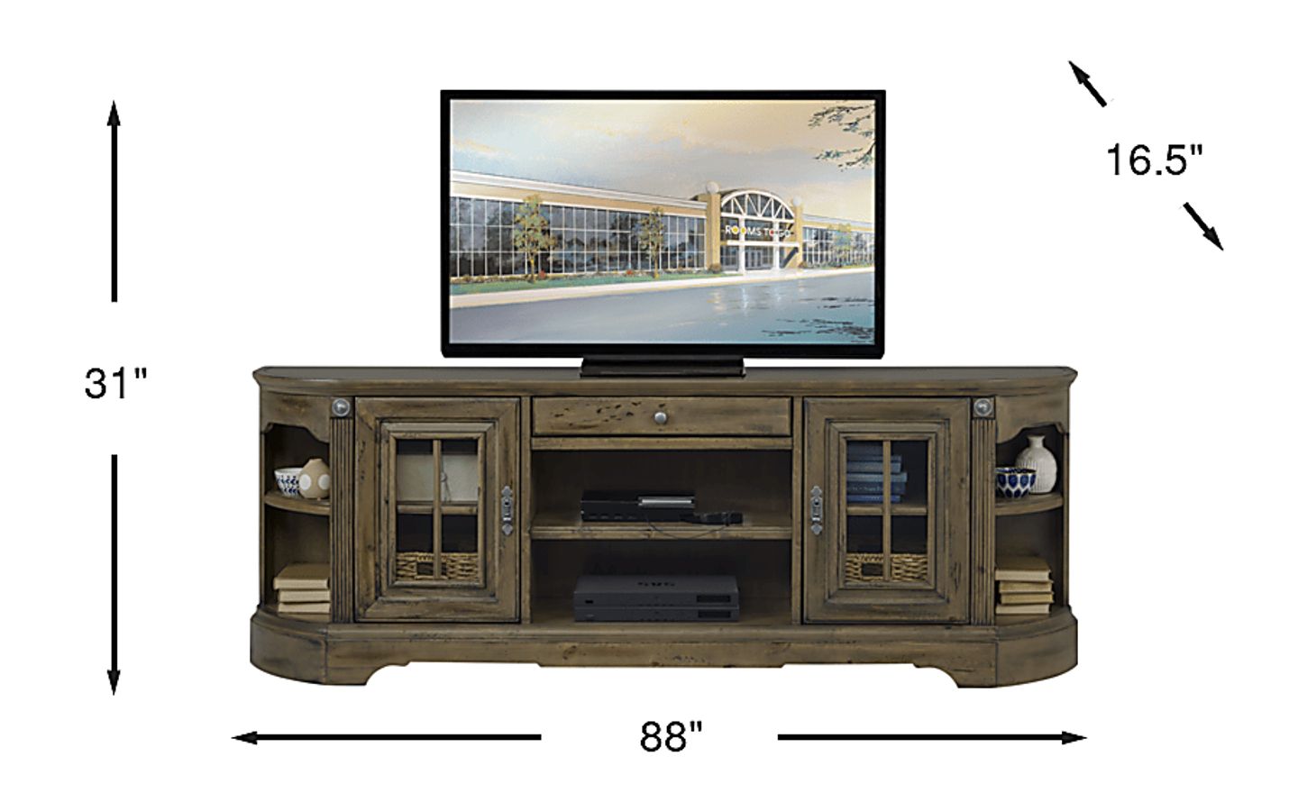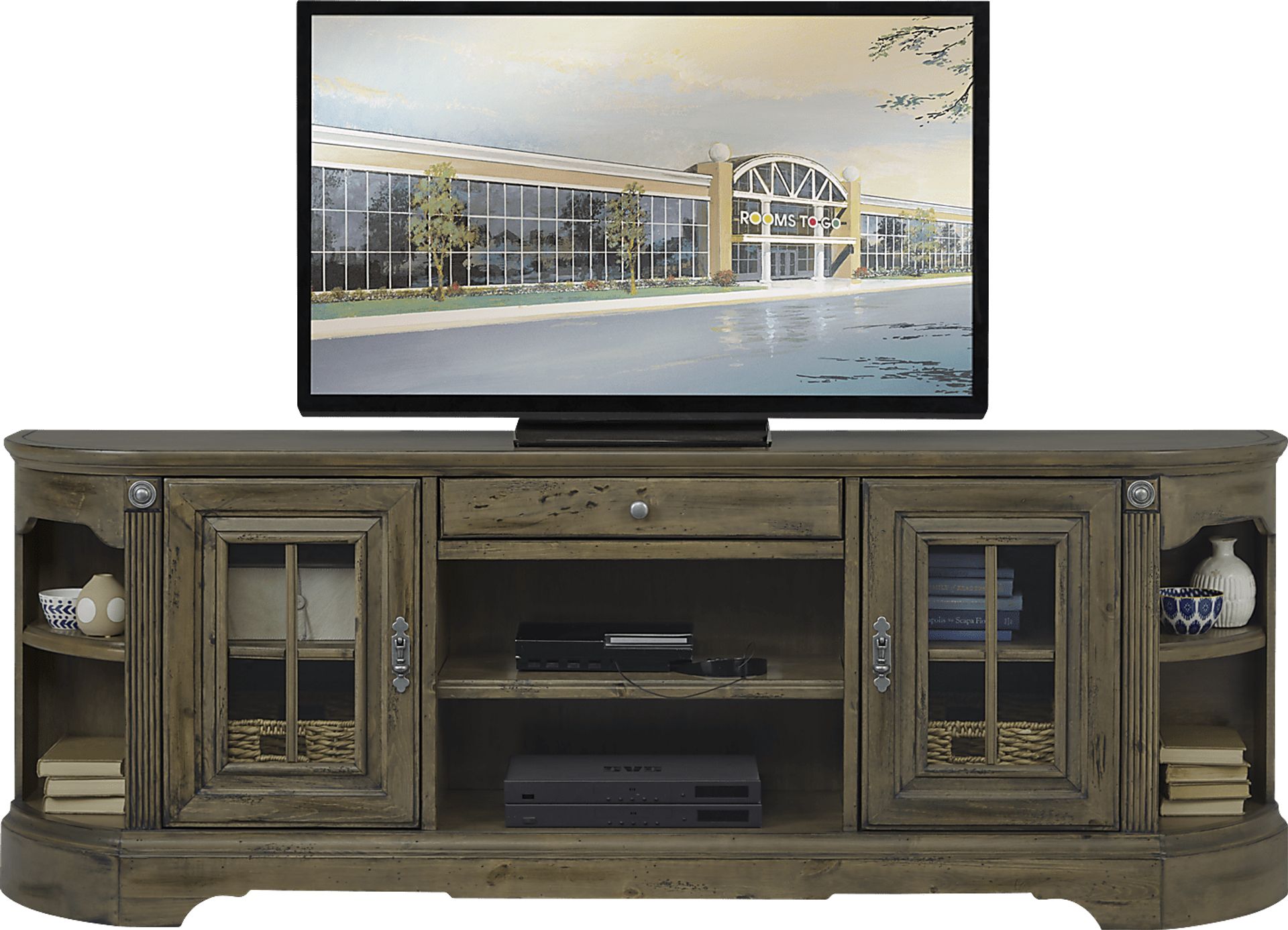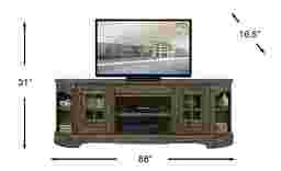 The Mountain Bluff is a traditionally styled console crafted in poplar solids and selected maple veneers. This impressive piece is enhanced by large scale moldings and subtle details rendered in a hickory finish and accented with barrel pewter finish hardware. The antique finish is hand applied, distressed, glazed and highlighted to capture the authentic worn look of yesteryear. The console features an open center area with two shelves for electronics, adjustable shelves behind two framed glass doors and cut outs for wire management. A drawer along the upper portion of the console and additional shelving on the ends provide an extra place to put TV accessories, manuals, or decor.