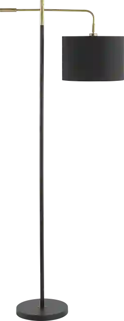 Step up any corner with the modern style and functionality of the Moyes View Black Floor Lamp. The clean and minimalistic design of this floor lamp lends practicality and effortless charm to any room. A slender stem and pivoting arm suspend a modern drum shade for a sleek and versatile appeal. With a pivoting arm and adjustable shade, our floor lamp helps in directing a soft glow to your desired area. Partial assembly may be required.