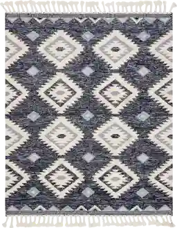 This rug is a practical choice for busy families. Its navy and gray color palette, combined with an intricate tribal pattern, is highly effective at masking minor footprints and everyday messes. However, because it features handcrafted raised woven areas and decorative fringe, we recommend keeping pet claws trimmed. These tactile textures provide a unique, multi-dimensional feel but can be susceptible to snagging from untended claws.