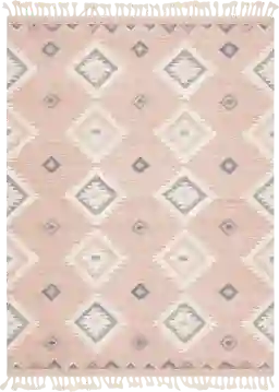 This rug features a subdued color palette of pink, ivory, and gray, which allows it to act as a "new neutral." Its transitional design is intended to bridge the gap between traditional and modern styles. The geometric tribal pattern pairs exceptionally well with leather sofas for a rustic look, or with clean-lined gray upholstery for a more contemporary, "boho-chic" aesthetic. The hints of gray and ivory ensure it doesn't overpower the room, even with the vibrant pink accents.
