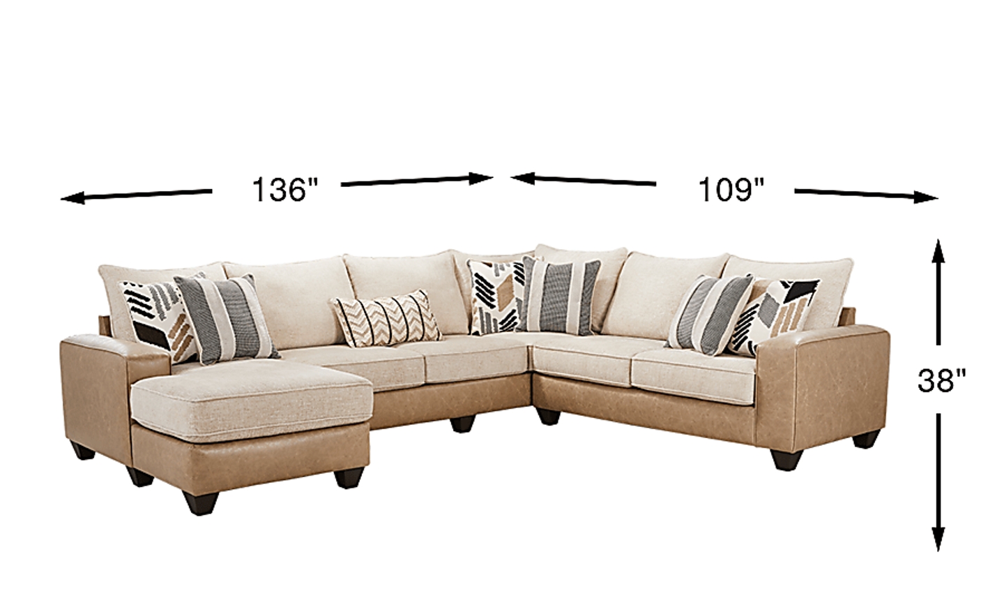 Runway-ready boho fashion makes its way into your heart and living room when the unique Murphy sectional and its warm, chunky personality come to shine. The standout seats of this collection stun with a two-tone, two-fabric design: soft woven beige on top and a smooth light brown on the base, arms and back. Scatterback pillows add to the relaxed atmosphere while included accent pillows bolster the earthy color palette. Upholstery: 100% Polyester. Cleaning Instructions: Use water based cleaning agents or foam.