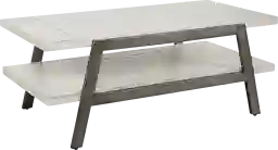 The perfect blend of modern and industrial, the Myha 48in. coffee table boasts fresh, on-trend design. This cockatil table features a plank top and lower shelf crafted from oak solids and veneers that is carefully poised between angled metal legs. The structured lines and two-tone finish are sure to make a bold statement in your home. Customer assembly is required.