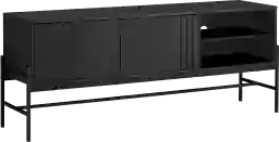 Add stylish and functional storage to your living room or bedroom with this trendy Myleen 59 inch tv stand and media console. This durable and fashionable contemporary stand is constructed in black laminate on top and supported with a sleek black metal frame. It offers plenty of storage for your media with a closed cabinet accented with sleek groove lines design on the doors, and open shelf space for your media equipment. This tv console unit includes a hidden wire management hole behind the fixed open shelving and another behind the spacious storage cabinet to keep your cables organized and out of sight. Easy to assemble with illustrated instructions and all necessary hardware included, means you will have this media entertainment center up and ready to use in no time. Customer assembly is required.