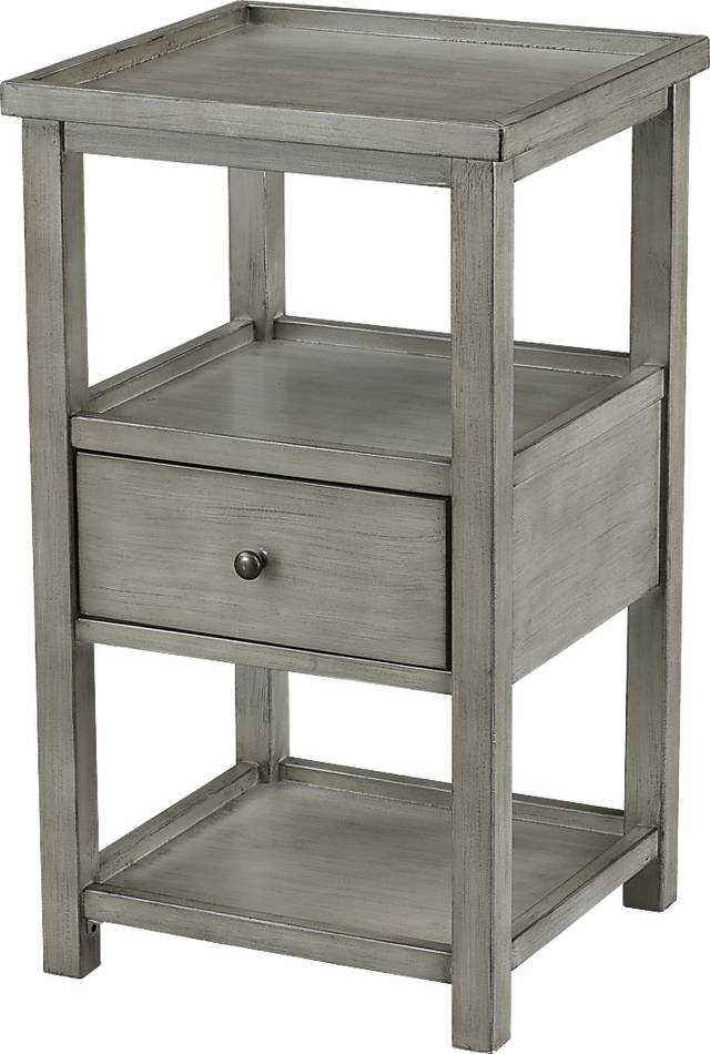 This one drawer Myrtledale chairside table will be as at home in your guest bath with rolled towels and soaps as it will in your sunroom with plants and magazines! Finished all the way around in gray, this lovely table also has 2 full lower shelves, both with raised framed edges - as does the top itself! And, with a roomy central drawer to hold remotes, toiletries, or perhaps your potting trowel and gloves, a great addition for your home! Customer assembly is required.
