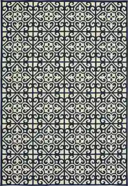 Designed with intricate patterns in navy and ivory tones, the Nadene rug will add style to your outdoor space. This rug is machine made with polypropylene. To clean, vacuum regularly.