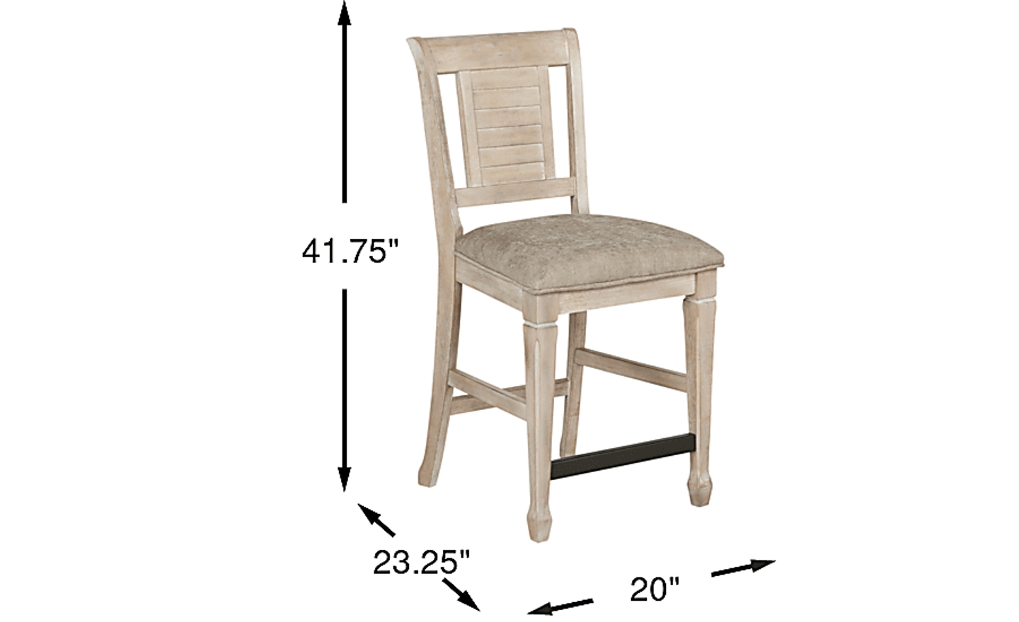 With its shuttered seat back and plush upholstered seat cushion, the Nantucket Breeze counter height stool offers coastal inspired charm at its finest. Crafted of hardwood solids and mindi veneers in a two-tone brushed bisque and caramel finish, this cozy stool makes all of your dinner guests feel right at home. Tapered legs and a footrest with a scuff protector provide support.