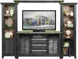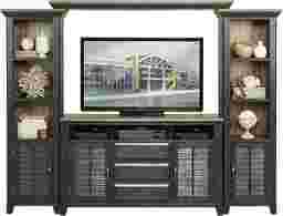 Casual coastal styling and plenty of media storage make the Nantucket Breeze wall unit a wonderful choice. It's crafted with wood solids and mindi veneers in a beautiful two-tone brushed black and gray finish. The center console has three open compartments for electronics as well as three raised panel storage drawers. Felt lining buffers items in the top drawer. Side piers boast display shelves. Each door, with charming shuttered panels, opens to reveal an adjustable shelf. Antique bronze finished hardware adds the final touch. (The TV opening is 60 x 18 x 40.)