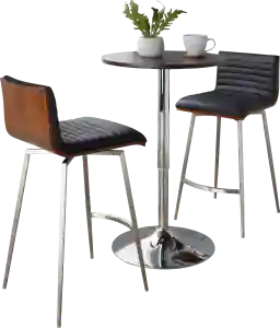 Create a cozy pub or bistro atmosphere in your home with the mid-century modern design of the Narsi Black Adjustable Swivel 3 Pc Counter Height Dining Set. This sleek table has a chrome metal base with a round wood top that adds a rich contrast. The adjustable bar table can be adjusted from dining to bar height. The stools add casual comfort with a padded upholstered seat and backrest. Available in a variety of upholstery colors, choose the one that ties in with your decor. Customer assembly is required.