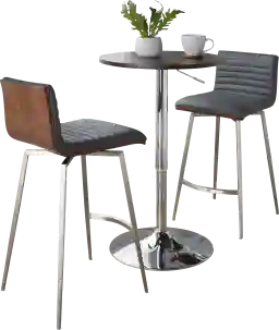 Create a cozy pub or bistro atmosphere in your home with the mid-century modern design of the Narsi Gray Adjustable Swivel 3 Pc Counter Height Dining Set. This sleek table has a chrome metal base with a round wood top that adds a rich contrast. The adjustable bar table can be adjusted from dining to bar height. The stools add casual comfort with a padded upholstered seat and backrest. Available in a variety of upholstery colors, choose the one that ties in with your decor. Customer assembly is required.